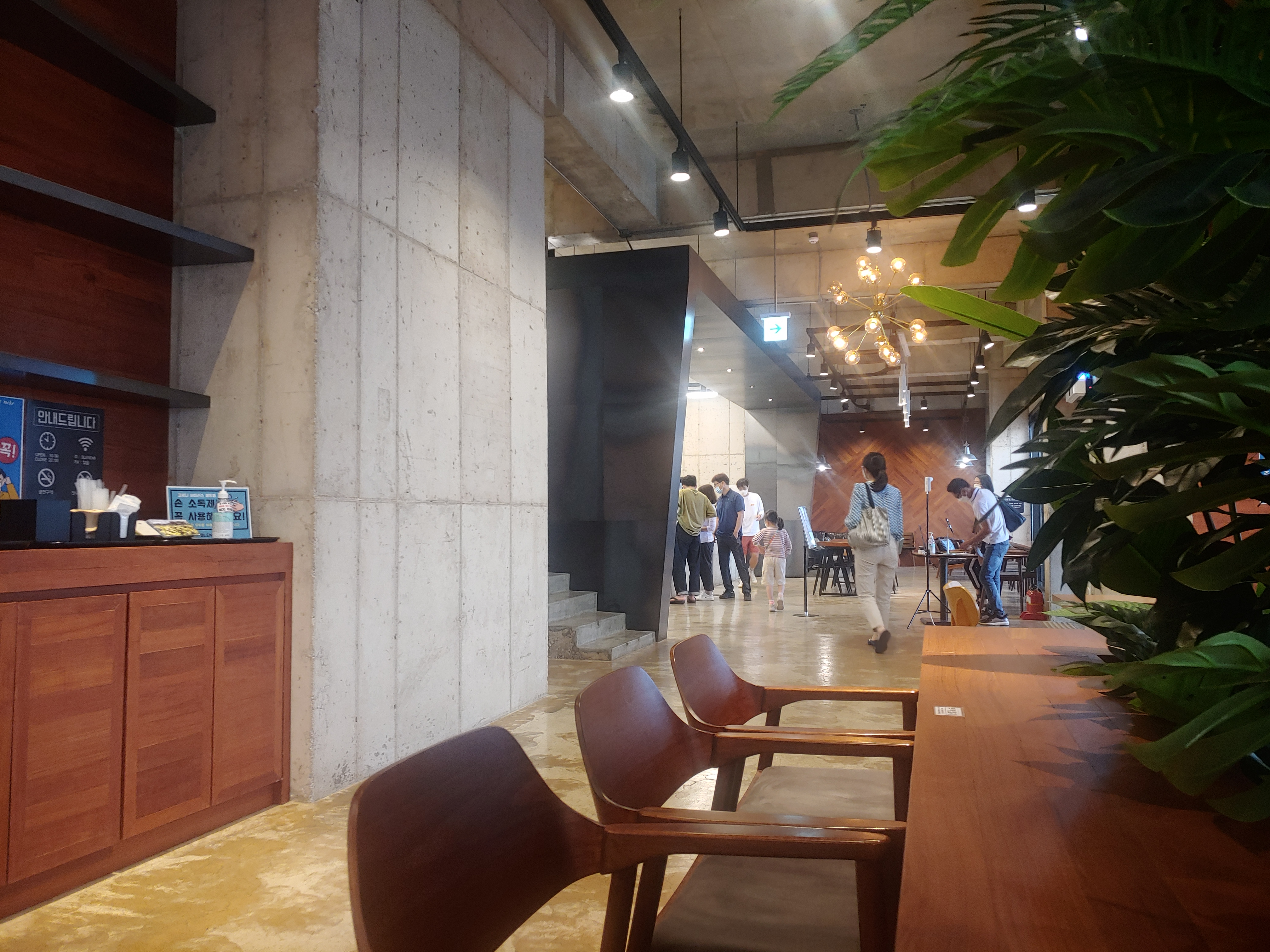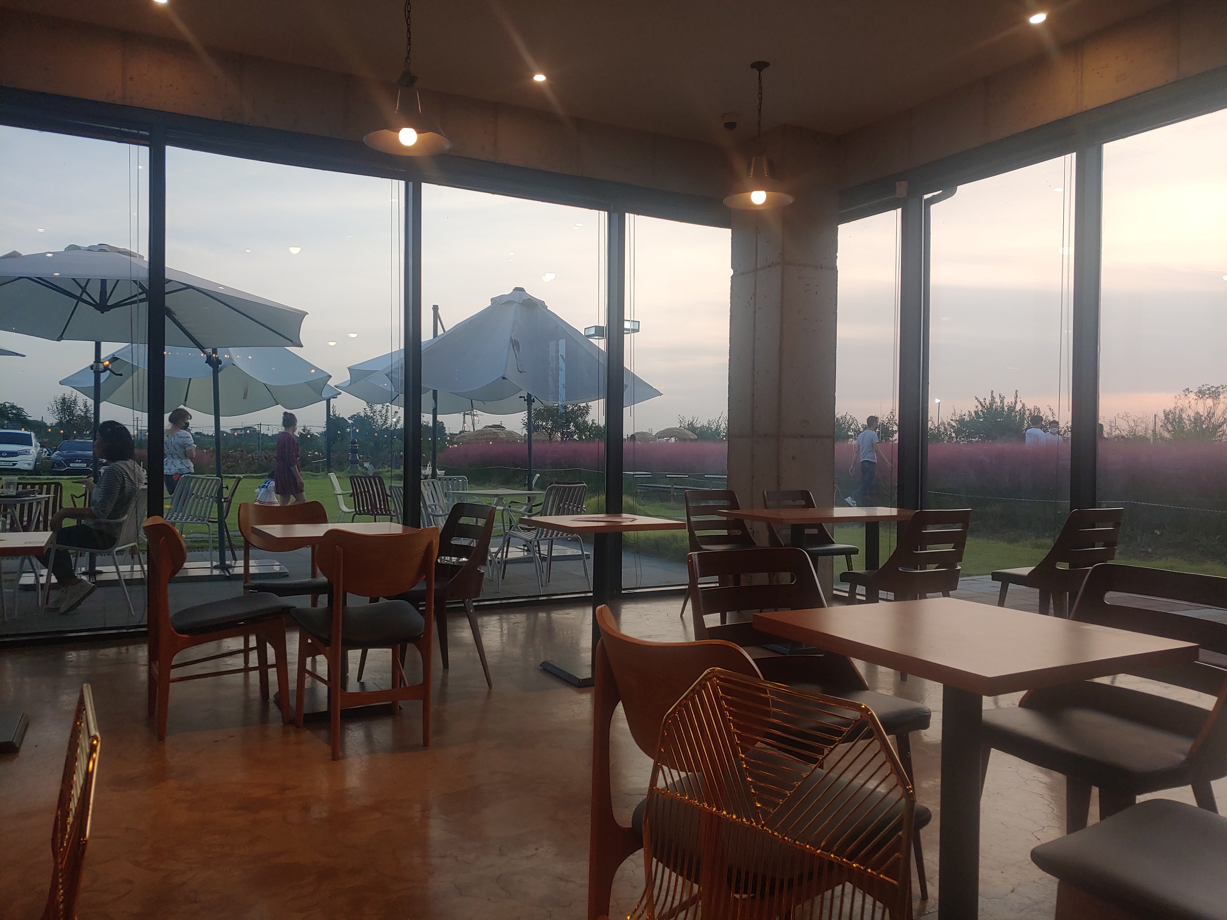 카페 내부는 이렇게 생겼어요. 사람들이 많이 빠졌을 때 찍어서 별로 없는 것 같지만 다들 밖에 나가서 사진 찍는데 삼매경이에요. 내부는 깔끔하고 얘기하기도 좋게 되어있지만 중간에 몇몇 의자들이 좀 불편하더라구요. 코로나 때문에 자리를 띄어놓기도 하더라구요. 그래도 시간대 잘 맞게 찾아가면 꽤 괜찮을 것 같아요.